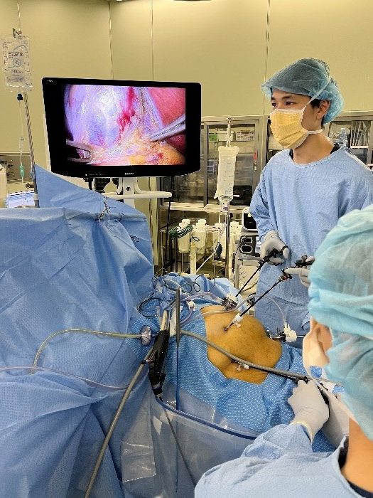 →全身麻酔下で行います。お腹に3か所の孔をあけ、内側からヘルニアの穴をメッシュで塞ぎます。傷が小さく、術後の痛みが少ないのが特徴です。